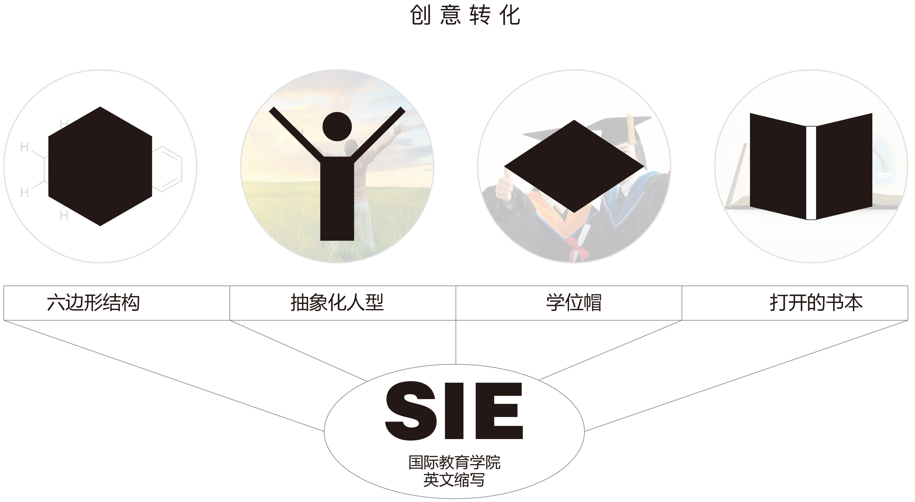图形结构稳定,均衡视觉识别性强,正负型转换使用方便。设计方案去除以往圆形徽章式束缚,强化图形概念,以利于视觉传递;从意涵概念中抽离出具象图型,经过抽象画设计后进行转化整合,以型达意,婉转且不过于直白。规避使用过于中式且传统的元素,在对外宣传推广使用时更显国际化,符合国际学院的发展定位。标识简洁大方,能够适用于不同材质、展现形式、应用环境,有利于国际学院整体形象系统化。