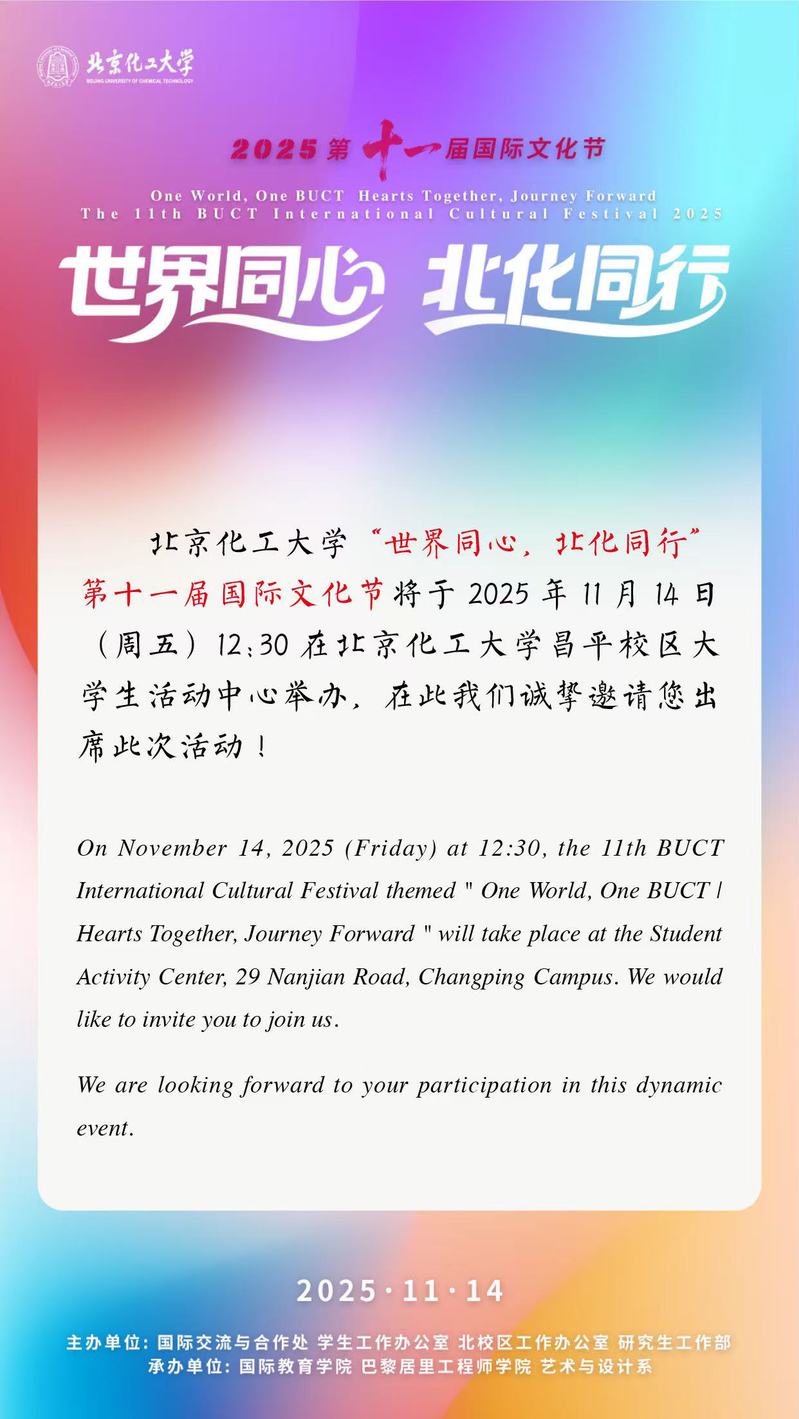 为顺应全球化深入发展需要,我校国际文化节历经十届积淀,已成为促进跨文化理解与融合的重要平台。第十一届国际文化节以世界同心,北化同行(One World, One BUCT | Hearts Together, Journey Forward)为主题,旨在通过情感共鸣与携手共进,深化人类命运共同体意识,推动中外学生在学术、文艺和创新领域的深度共创。