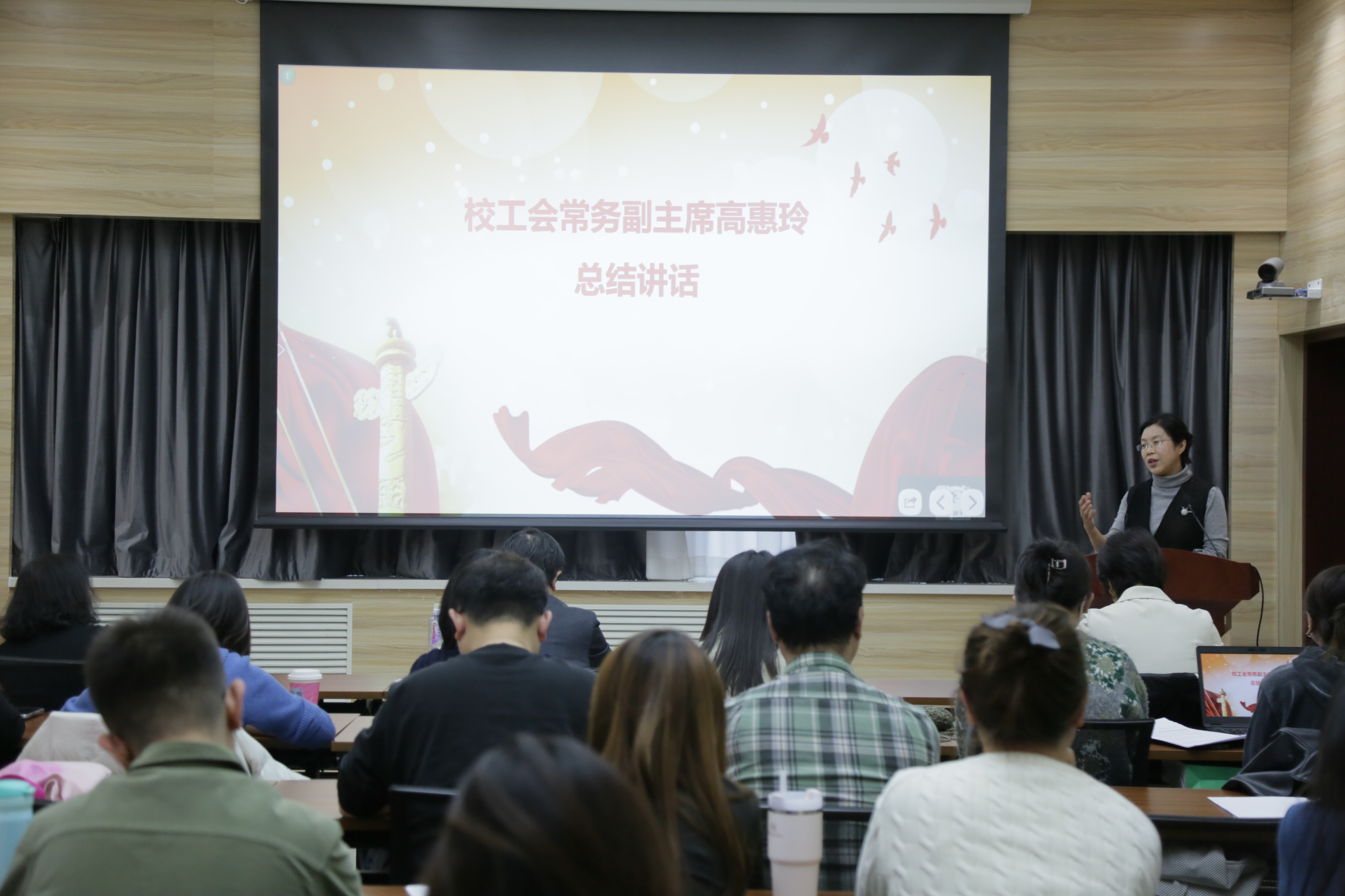 校工会常务副主席高惠玲作总结讲话,她充分肯定了上一届教职工大会常设主席团和工会委员会的工作成效,并对新一届成员提出殷切期望,希望新一届成员继续团结带领全院教职工凝心聚力,推动学院各项事业高质量发展。她强调,新一届教职工大会常设主席团和工会委员会要立足自身特点,进一步引领全院教职员工强化服务意识、提升育人水平,切实发挥好党联系职工群众的桥梁纽带作用。