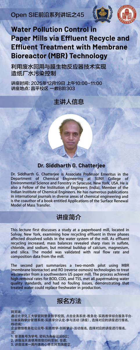 12月19日,Open SIE第45期前沿讲坛在昌平校区顺利举行。本次活动特邀美国纽约州立大学环境科学与林业学院化学工程系名誉副教授Siddharth G. Chatterjee担任主讲嘉宾,为师生带来了一场主题为“利用废水回用与膜生物反应器技术实现造纸厂水污染控制”的专题学术讲座,吸引了众多相关专业学生的积极参与。