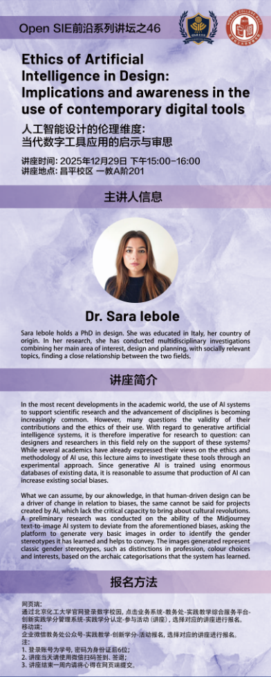 12月29日,Open SIE第46期前沿讲坛在昌平校区顺利举行。本次活动邀请了意大利热那亚大学设计学博士Sara Iebole担任主讲嘉宾,为学生们带来了一场主题为“人工智能设计的伦理维度:当代数字工具应用的启示与审思”的专题学术讲座,吸引了众多同学踊跃参与。