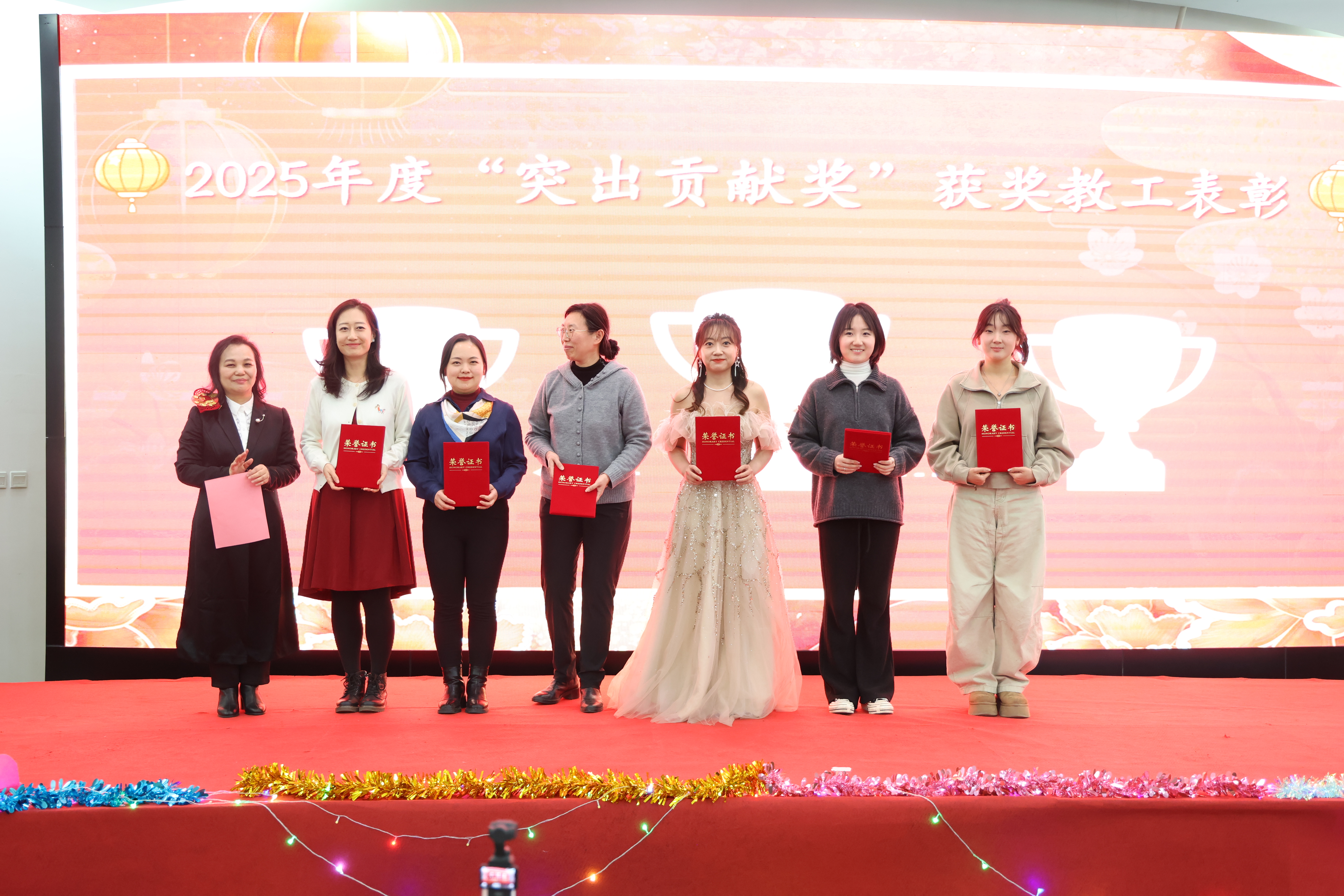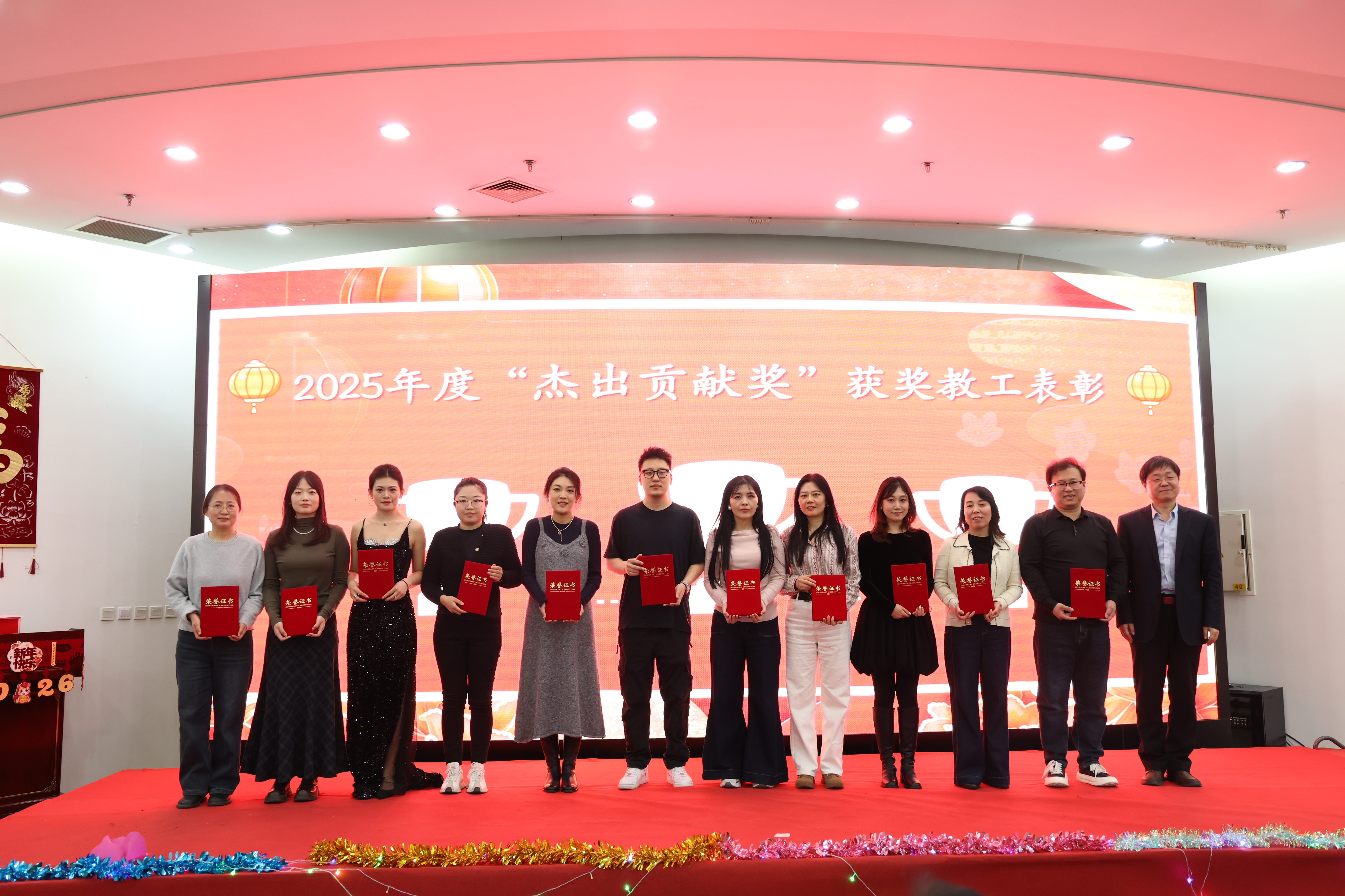 会议隆重颁发了2025年度学院"杰出贡献奖""突出贡献奖"及单项奖荣誉。学院领导亲自为获奖教职工颁发证书,并勉励全体教职工以先进为榜样,凝心聚力、砥砺前行,共同谱写学院高质量发展新篇章。