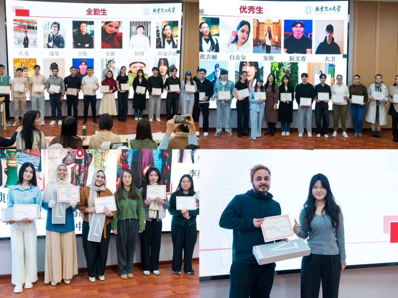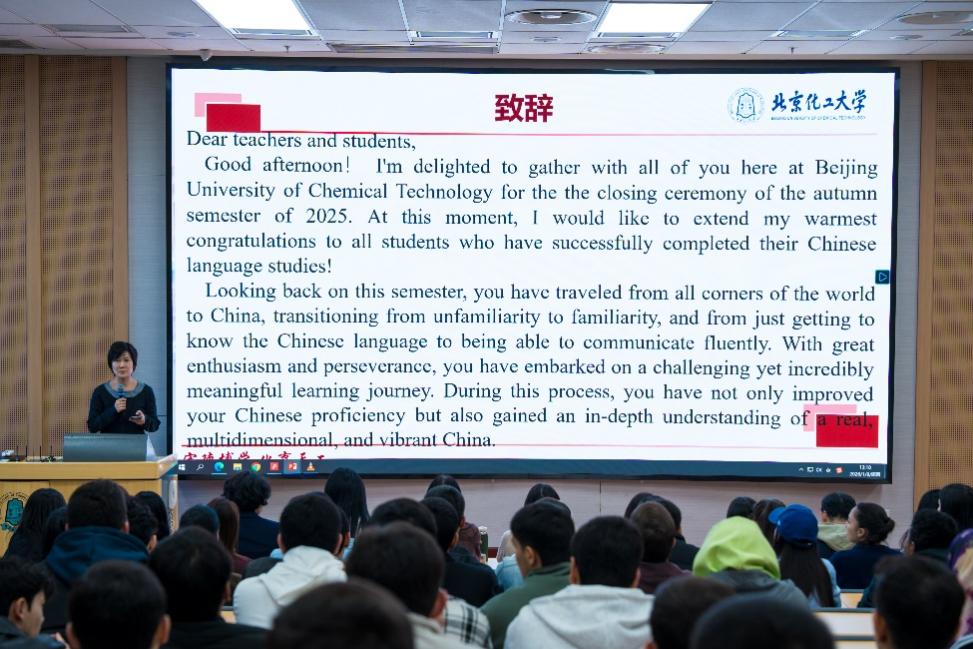 典礼在庄严的氛围中开始,于跃首先致辞。她代表学院向圆满完成本学期汉语学习的全体同学表示热烈祝贺,并充分肯定了同学们在语言学习和文化体验中展现的勤奋与热情。于跃副院长指出,北京化工大学始终坚持国际化办学方向,致力于为各国学子提供优质的教育资源与交流平台。她勉励同学们继续深耕汉语学习,未来在不同领域发挥桥梁作用,为推动文明互鉴、增进国际友谊贡献力量。随后,于跃向各班全勤生颁发了证书和礼品。