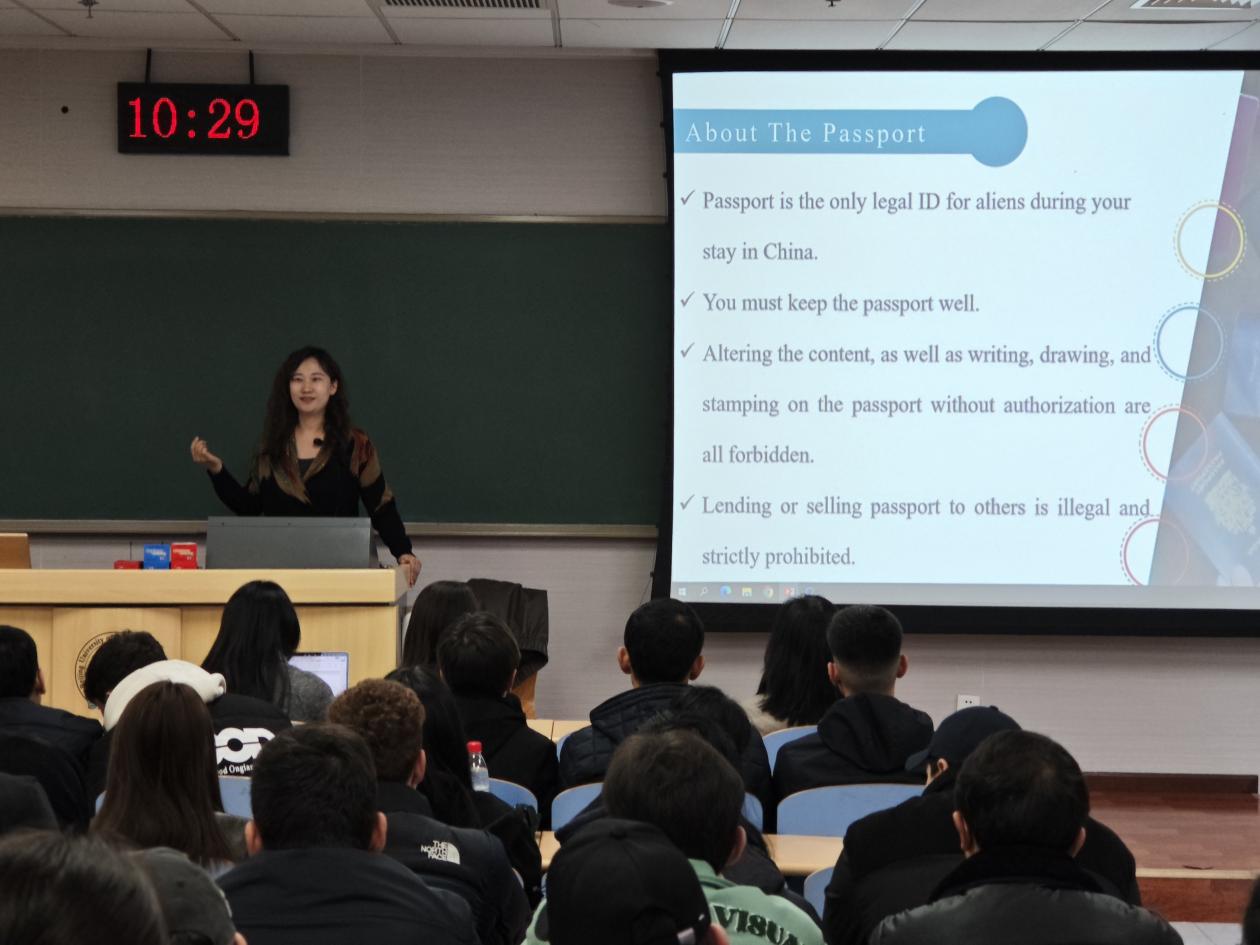 随后,汉语进修生教学教务李蕊老师上台总结了过往学期大家在公共安全、校园秩序及宿舍纪律等方面遇到的问题与教训。她没有堆砌生硬条款,而是像一位贴心的“生活向导”,从校园安全、法律法规、宗教信仰处理,到宿舍纪律规范,为远在异国的学子们再次编织起一张温暖的“安全网”,确保大家在校生活安心无忧。