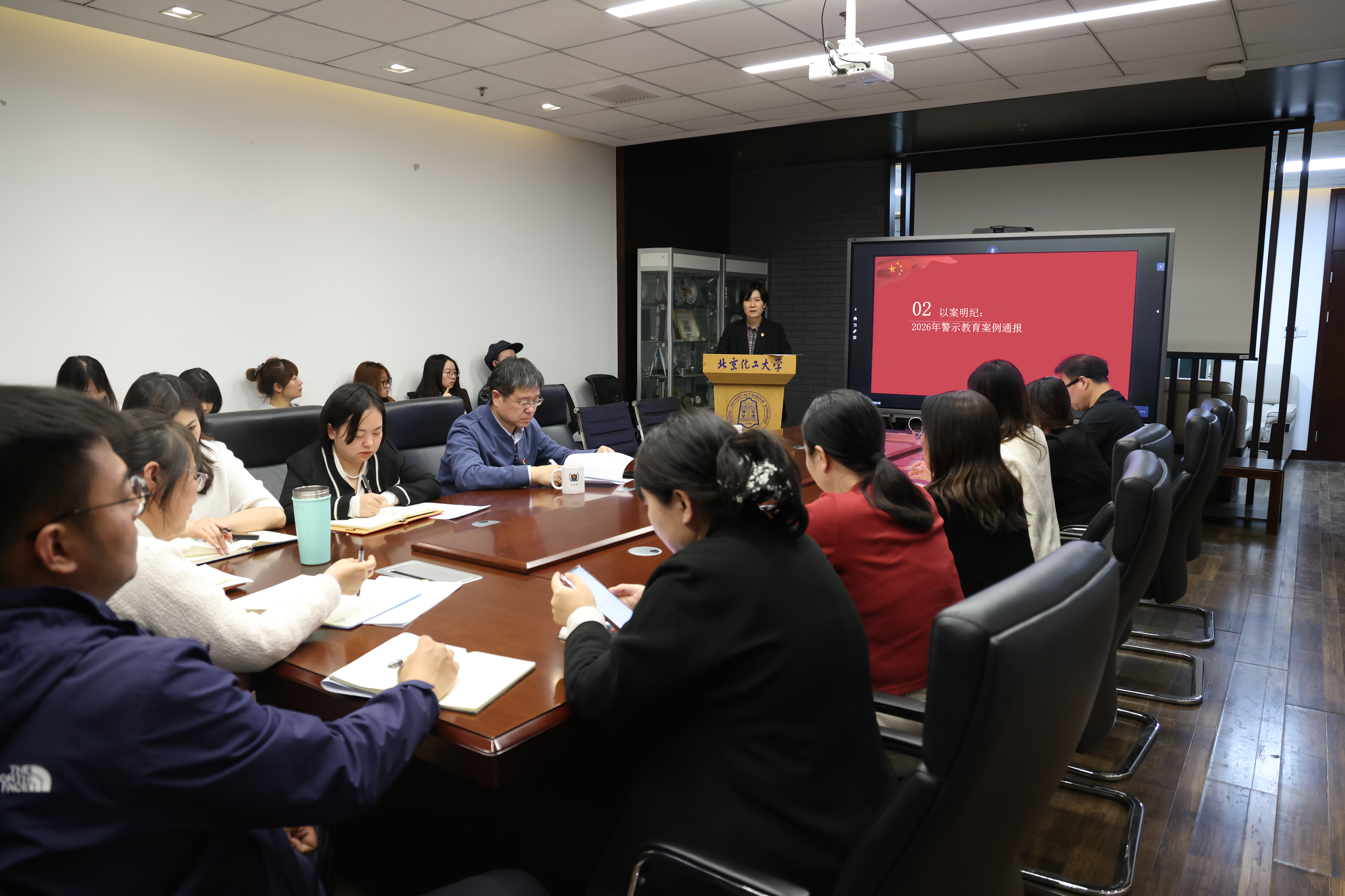 会上,党总支副书记、纪检工作负责人于跃通报了2026年教育系统及学校内部发生的典型警示教育案例,案例涵盖招生录取、科研经费使用、师德师风建设等多个领域,涉案情节发人深省,教训极为深刻。结合学院涉外办学的特殊性,于跃重点剖析了意识形态阵地管理、外事经费使用规范、师德底线坚守、保密纪律执行等方面的潜在风险点。她提出,必须彻底摒弃麻痹思想和侥幸心理,真正把自己摆进去、把职责摆进去、把工作摆进去,以案为鉴、警钟长鸣,坚决守住政治底线、廉洁底线和安全底线,做到心有所畏、言有所戒、行有所止。